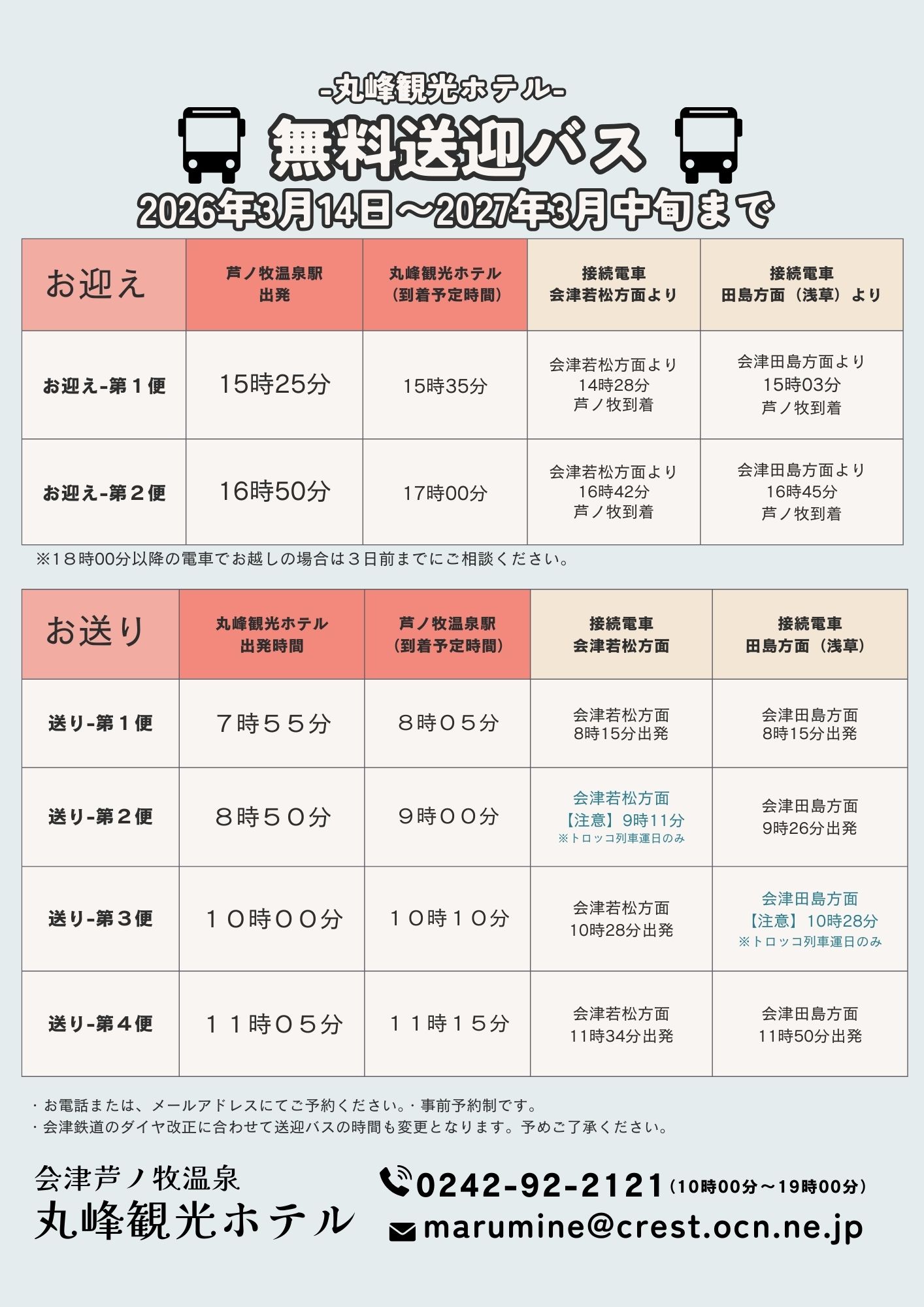 2026年3月14日(土)より新しい運行スケジュールにて運行いたします。 ご利用のお客様は、事前に運行時刻をご確認のうえ、ご予約をお願いいたします。 なお、送迎バスは事前予約制となっております。 詳細は送迎時刻表をご確認ください。 何卒ご理解のほどよろしくお願い申し上げます。